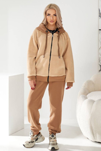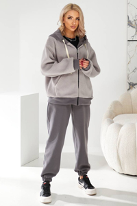 Сучасний затишний костюм, ідеально підходить для холодного сезону, поєднуючи спортивний комфорт та модні акцентні матеріали. Комплект складається зі штанів та утепленого худі на блискавці.