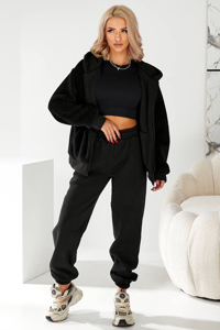 Штани виконані з теплої тринитки на флісі, яка забезпечує чудову теплоізоляцію та м'якість. Вони мають спортивний крій зі злегка завуженою формою та еластичною резинкою знизу (джогери). Зручний еластичний пояс гарантує комфортну посадку на талії. Цей костюм – ідеальне поєднання практичності та затишку, що створює стильний та теплий повсякденний образ.