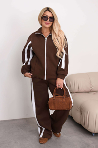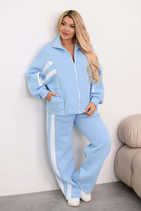 Теплий стильний спортивний костюм, зшитий з м'якої та щільної тринитки на флісі. Цей матеріал забезпечує чудове збереження тепла та комфорт у прохолодну пору року. Виріб складається з кофти на блискавці та широких штанів. Кофта вільного крою (оверсайз) з високим коміром-стійкою. Модель застібається на центральну блискавку, оздоблену контрастним кантом. Рукави прикрашені контрастними смугами, що підкреслює спортивний стиль. З боків розташовані прорізні кишені.