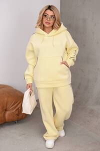 Теплий стильний спортивний костюм, зшитий з турецької тринитки на флісі. Тканина має високу якість, не кошлатиться і не втрачає колір після прання, забезпечуючи довговічність. Виріб складається з худі та штанів. Худі вільного, об'ємного крою з глибоким капюшоном та функціональним шнурком-затяжкою. Спереду розташована велика зручна кишеня-кенгуру. Усі шви виробу оброблені декоративним бавовняним кантом контрастного кольору, що надає моделі графічності та стилю.
