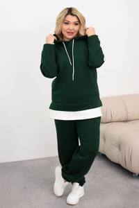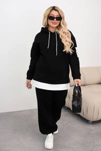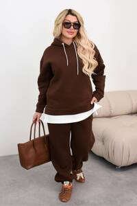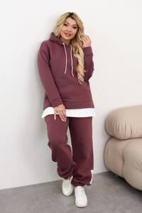 Подовжене вільне худі з капюшоном, вільний фасон, спущений рукав. Джогери внизу на резинці, посадка висока, пояс також на резинці, є бокові кишені. Костюм доповнений стильними нашивками.