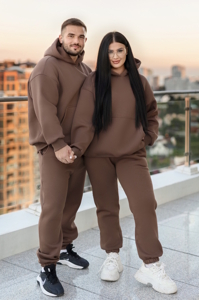Худі з подвійним капюшоном, дві кнопки для його фіксації, манжети рукавів на резинці, спереді накладна кишеня кенгуру. Джогери на виоскій посадці, пояс на резинці та шнурку, понизу виробу манжети на резинці.