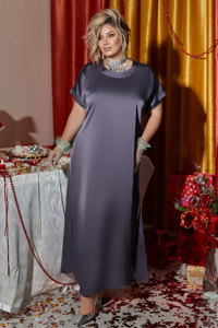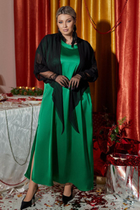 Сукня має вільний, прямий крій та довжину максі. Круглий виріз горловини. Для динаміки та жіночності модель має високі бічні розрізи. Накидка з прозорого шифону має рукава ¾ та прикрашена стразами на спинці, що додає образу витонченого сяйва. Це ідеальний виріб, який чудово підійде для створення розкішного образу на святкові події, вечірки та корпоративи. Комплект легко комбінується з туфлями на підборах та вишуканими прикрасами, забезпечуючи ошатність та елегантність.