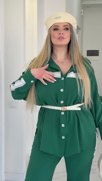Костюм вільного крою, що поєднує елегантність і комфорт. Сорочка прикрашена мереживним декором на грудях і лампасами на рукавах, має спущений рукав із манжетом і застібку на ґудзики. Брюки прямого вільного силуету з високою посадкою, доповнені мереживним лампасом, еластичною талією на гумці та зручними бічними кишенями.Блуза вільного крою з рукавом напівлетюча миша та манжетом, застібається на ґудзики. Брюки також вільного силуету, з високою посадкою, еластичною талією на гумці, двома бічними кишенями та розрізами внизу.