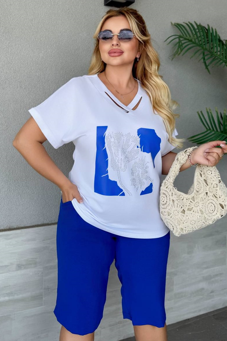 Комфортний літній костюм — чудовий вибір для спекотних днів. Футболка виготовлена з турецького куліру, що відзначається довговічністю та приємністю до тіла, доповнена якісним, стійким до прання накатом. Шорти подовжені, зручної довжини нижче коліна, з практичними кишенями з боків.