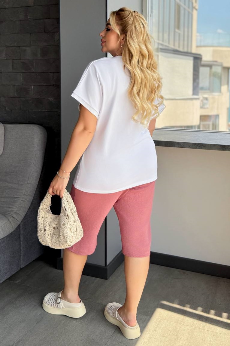 Комфортний літній костюм — чудовий вибір для спекотних днів. Футболка виготовлена з турецького куліру, що відзначається довговічністю та приємністю до тіла, доповнена якісним, стійким до прання накатом. Шорти подовжені, зручної довжини нижче коліна, з практичними кишенями з боків.