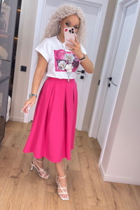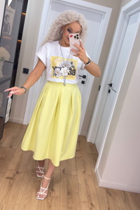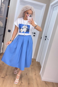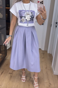 Довга елегантна спідниця зі складками має високу посадку та застібається збоку на металеву потаємну блискавку. Об’ємні складки по всьому колу створюють трапецієподібний силует, а висока талія візуально підкреслює стрункість фігури. Футболка зі спущеною лінією плеча виконана з преміум куліра — м’якого трикотажу зі 100% натуральної бавовни. Такий крій надає образу невимушеності й водночас стильності. Модель ідеально підходить як для щоденного носіння, так і для створення багатошарових комплектів. Натуральна тканина приємна до тіла та забезпечує комфорт протягом дня.