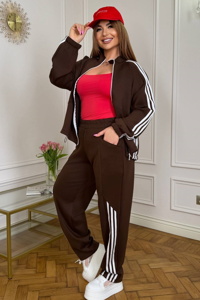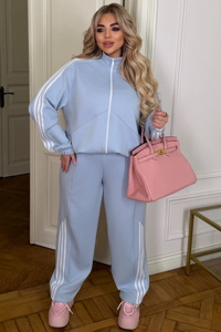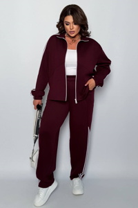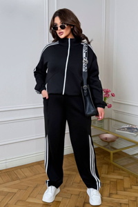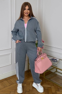 Кофта вільного прямого крою із центральною застібкою на блискавку та коміром-стійкою. Довгі рукави реглан доповнені манжетами на резинці, а декоративні лампаси проходять уздовж рукавів і спереду. Модель має бокові кишені, низ регулюється куліскою з фіксаторами. Штани з комфортною вільною посадкою та прямим кроєм.
