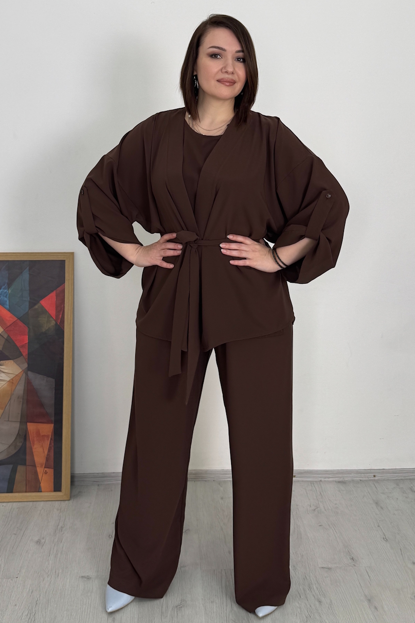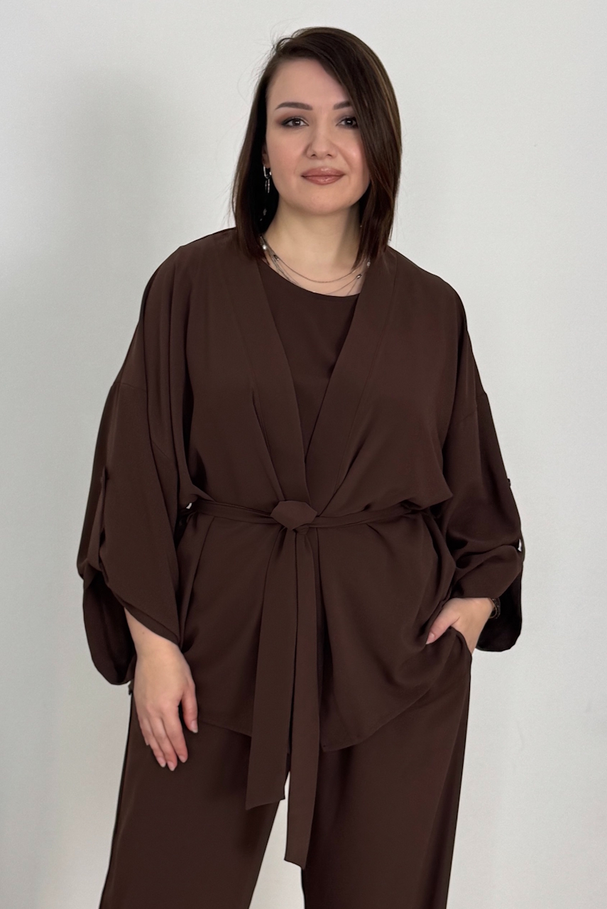 Сорочка вільного силуету по типу кімоно, рукав довгий, що регулюється хлястиком, талію можна підкреслити пояском. Широкі штани-палаццо на високій посадці, пояс на резинці, по боках кишені. Майка вільного фасону. Легка тканина приємна на дотик, не парить, не просвічується.