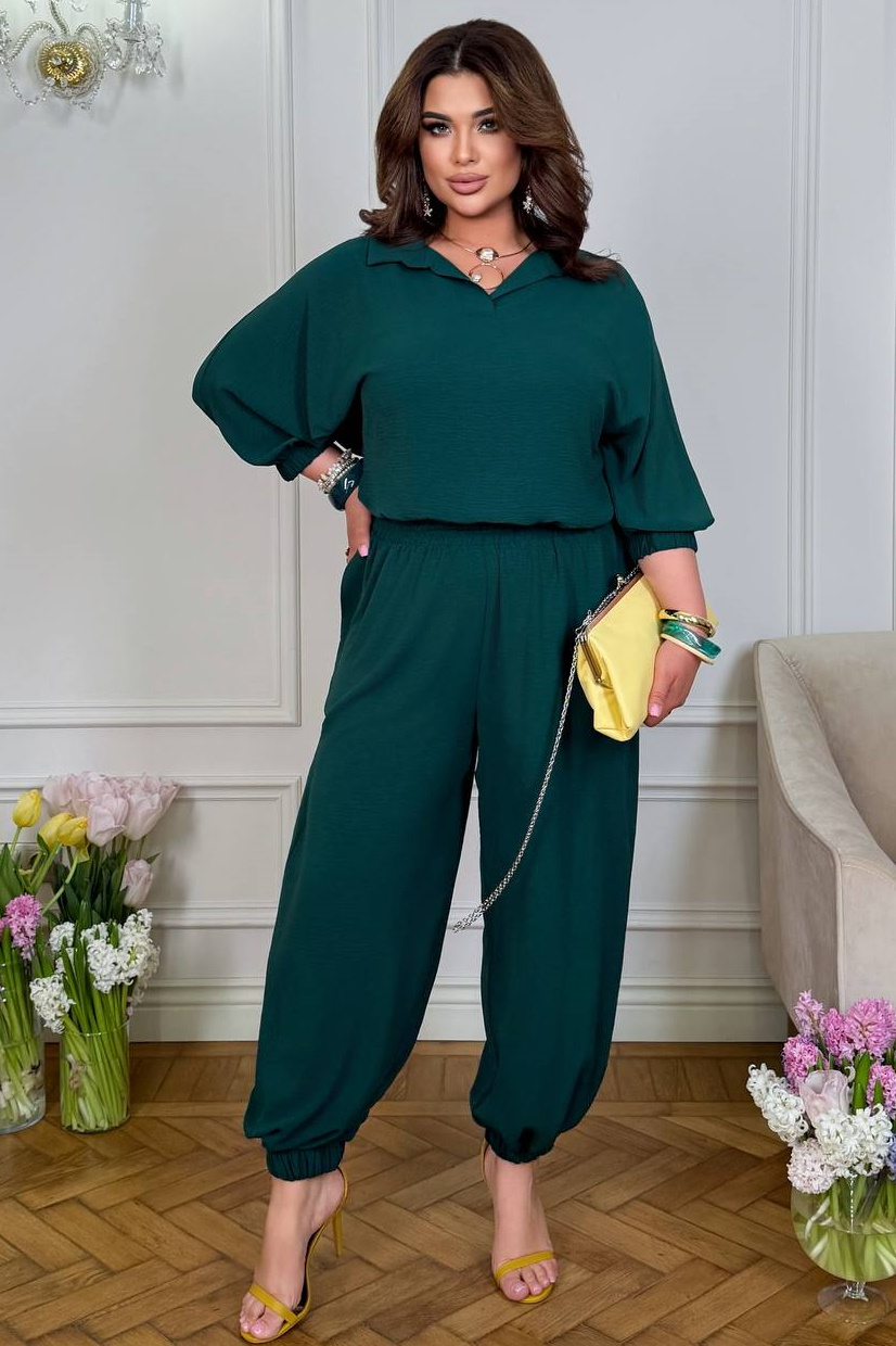Блуза вільного силуету з відкладним коміром сорочкового типу та м’яким відкритим вирізом. Рукави 3/4, об’ємні, зібрані на резинку. Штани-алладіни вільного, об’ємного крою з кишенями, оснащені широким еластичним поясом і резинкою по низу.