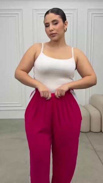 Блуза вільного силуету з бічними розрізами, низ регулюється куліскою. Штани прямого крою, просторі та зручні, доповнені бічними кишенями, поясом на резинці та стильними лампасами.
