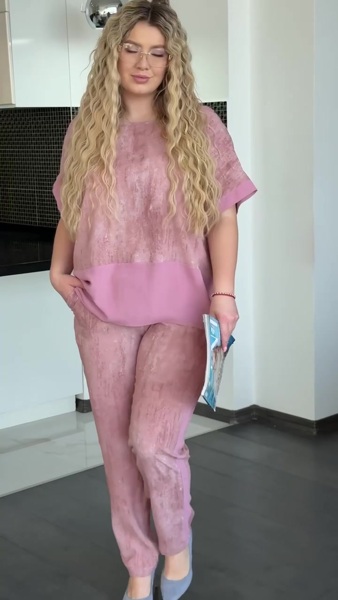 Костюм складається з вільної блузи зі спущеним рукавом і манжетом, а також брюк вільного крою з високою посадкою, еластичною талією та зручними кишенями. Це легкий, стильний і витончений образ, що поєднує комфорт і модний мінімалізм, ідеальний для будь-якої нагоди.