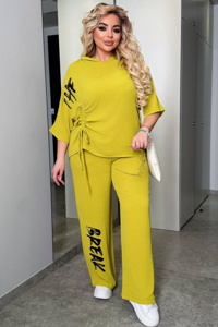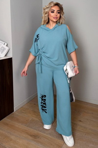 Стильний костюм-двійка з оригінальним накатом на капюшоні, рукавах і штанах. Блуза має цікавий дизайн: збоку передбачена зборка на шнурку, що дозволяє регулювати об’єм, приспущений рукав довжиною нижче ліктя створює легкий силует. Особливий акцент — розріз на плечі одного рукава. Штани-кльош із еластичним поясом зручно сідають по фігурі, доповнені практичними кишенями з боків.