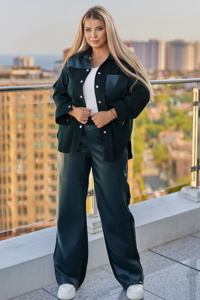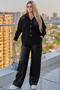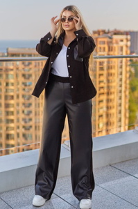 Стильний комплект, що складається з сорочки та штанів. Сорочка вільного силуету, з накладною кишенею з еко-шкіри на грудях і декоративними вставками на плечах, спереду застібається на кнопки. Штани поєднують еко-шкіру спереду та мікровельвет ззаду, мають прямий вільний крій, високий пояс на резинці та зручні кишені.