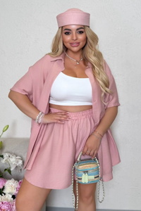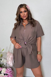 Стильний літній костюм — ідеальне рішення для спекотних днів. Комплект складається з вільної сорочки з коротким рукавом, яку можна зав’язати на вузол, створюючи легкий і невимушений образ, та комфортних шортів з м’якою резинкою на талії. Легка, приємна до тіла тканина дарує повний комфорт у носінні, а поєднання з яскравим топом додає свіжості та жіночності. Такий look легко адаптується як для міських прогулянок, так і для відпочинку.
