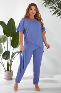 Блуза асиметричного крою, вільна, під пояс. Штани на поясі-гумці мають з боків зручні прорізні кишені і шлейки для пояса. Тканина чудово лягає по фігурі, створюючи легкі м'які складки, вдало приховують недоліки пишної фігури. Трикотаж жатка ідеальна тканина для фігури розмір плюс завдяки своїй еластичності і високому вмісту віскози.