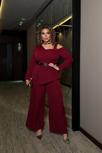 Блуза оригінального крою з одним оголеним плечем та декоративною прикрасою створює ефектний акцент. V-подібний виріз підкреслює лінію декольте, а кльошений низ із розрізом додає легкості й руху. По спинці розташована золота блискавка. У комплекті — чорний пояс з декоративною прикрасою. Штани-кльош актуальної довжини красиво подовжують силует. Посадка комфортна: талія на блискавці, ззаду — еластична резинка, зручні кишені розміщені з боків.