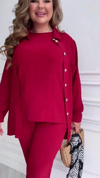 Елегантний та стильний жіночий костюм - трійка. Верхня подовжена сорочка вільного крою з довгими рукавами. На грудях накладна кишеня, бокові шви оформлені розрізами.