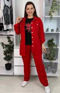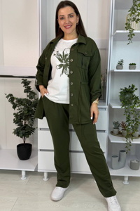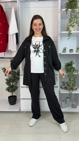 Костюм-трійка складається з подовженої кофти, штанів і футболки. Кофта на ґудзиках, з робочими кишенями на грудях і додатковими кишенями з боків. Талія підкреслюється куліскою, завдяки якій можна змінювати об’єм і посадку. Штани зручні, на резинці, із боковими кишенями та акуратними розрізами знизу збоку. Футболка виконана з якісним накатом, який не тріскає та не втрачає колір, рукав — до ліктя.
