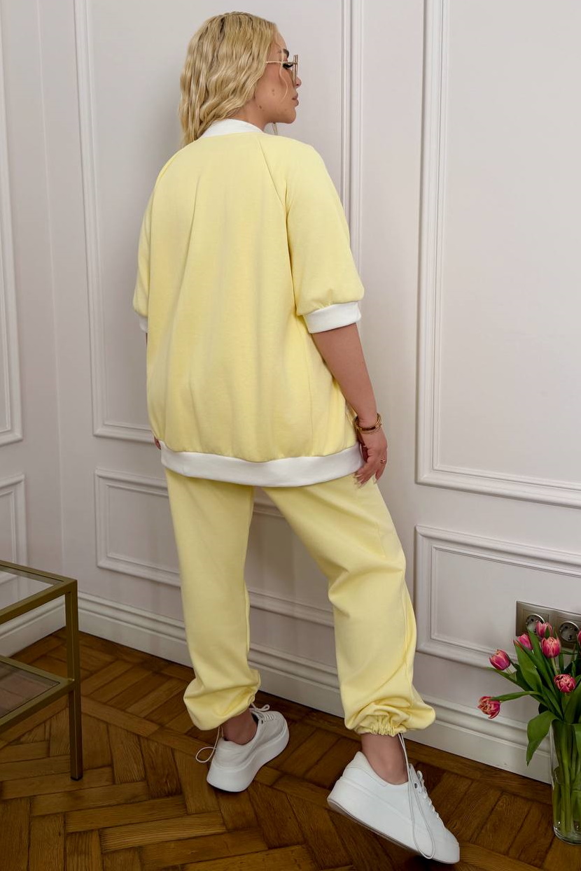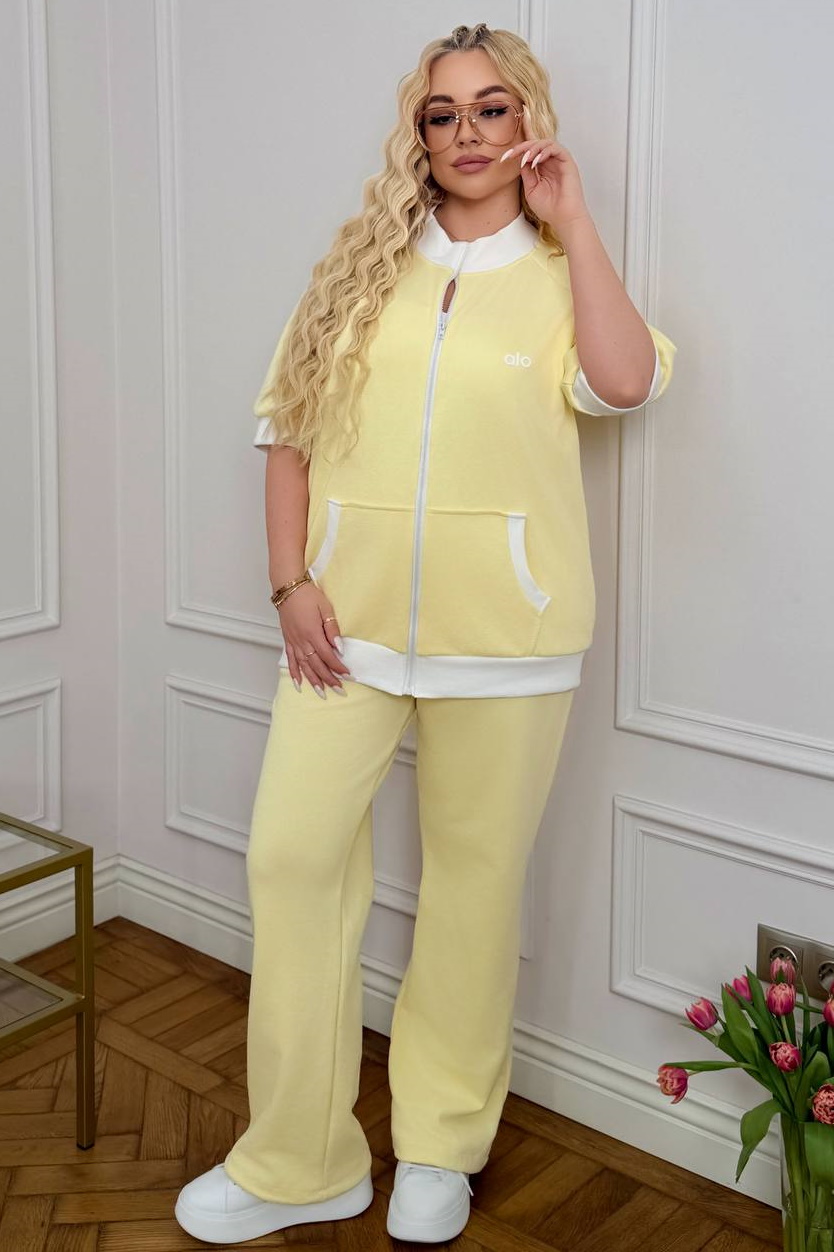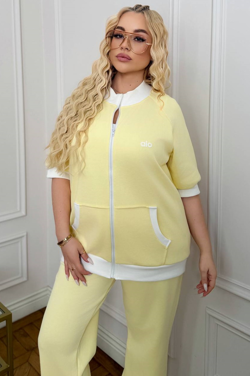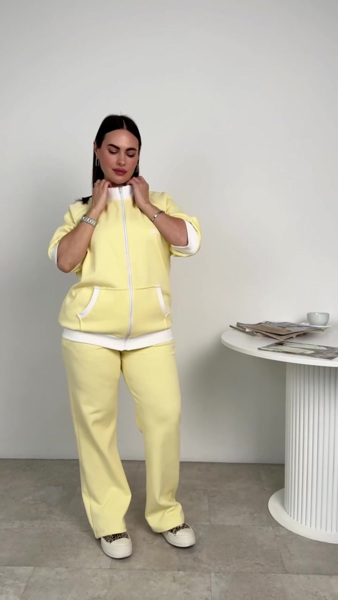 Кофта на блискавці доповнена зручними кишенями, а штани мають глибоку високу посадку та фіксатори внизу, що дозволяє легко перетворити їх на джогери; також модель оснащена практичними функціональними кишенями для максимального комфорту.