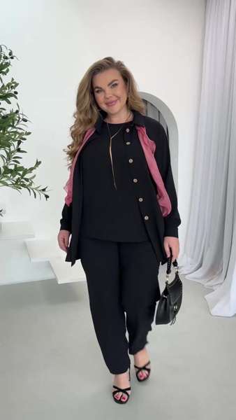 Елегантний та стильний жіночий костюм - трійка. Верхня подовжена сорочка вільного крою з довгими рукавами. На грудях накладна кишеня, бокові шви оформлені розрізами.