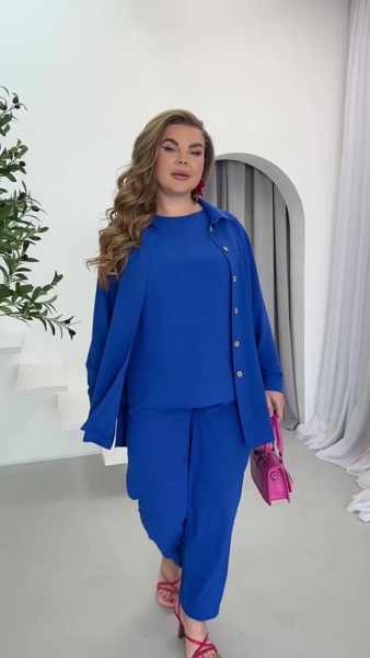 Елегантний та стильний жіночий костюм - трійка. Верхня подовжена сорочка вільного крою з довгими рукавами. На грудях накладна кишеня, бокові шви оформлені розрізами.