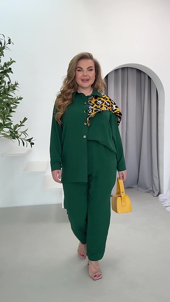Елегантний та стильний жіночий костюм - трійка. Верхня подовжена сорочка вільного крою з довгими рукавами. На грудях накладна кишеня, бокові шви оформлені розрізами.