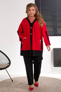 Піджак подовжений вільного фасону, довгий спущений рукав, на гудзиках, комбінація двох тканин. Брюки класика, пояс на резинці, посадка висока.
