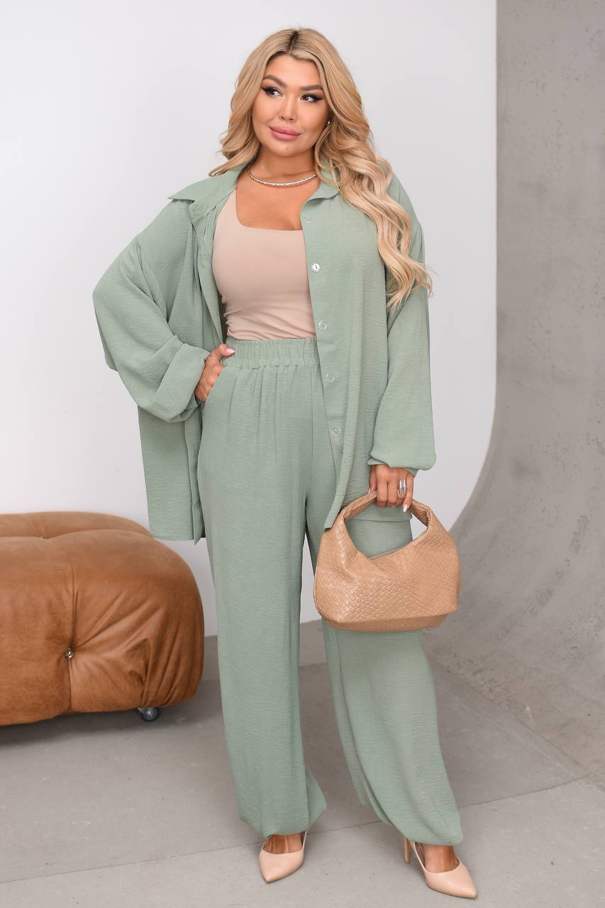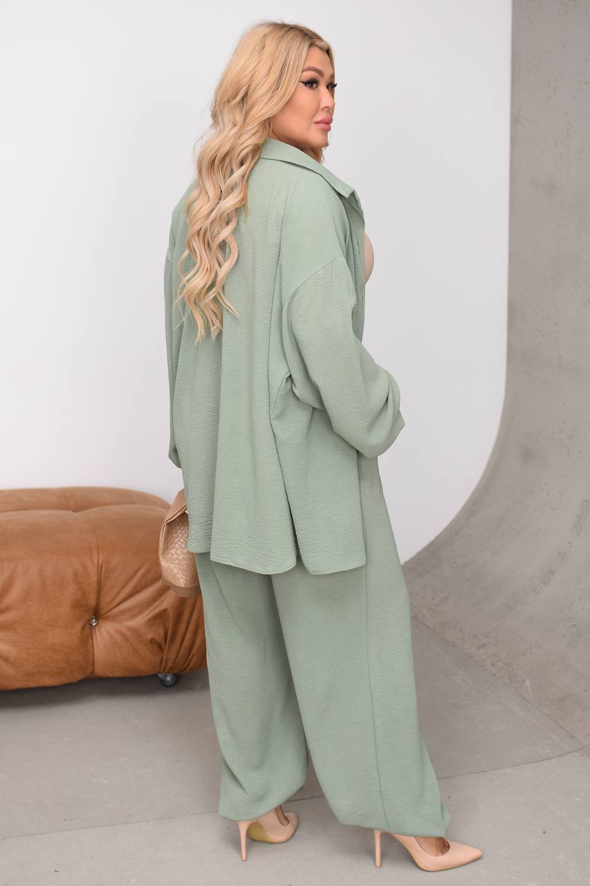 Подовжена вільна сорочка на гудзиках. Штани вільні палаццо, пояс на резинці, посадка висока.
