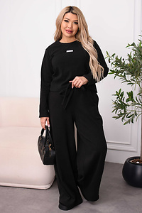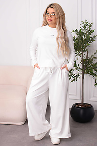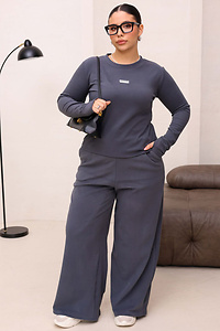 Зручний повсякденний костюм, пошитий із м'якого трикотажу. Еластична тканина добре пропускає повітря та ніжно прилягає до тіла, даруючи відчуття затишку протягом усього дня. Верхня частина представлена лонгслівом приталеного фасону з класичною округлою горловиною. Лаконічний напис англійською на грудях слугує стильним мінімалістичним акцентом.