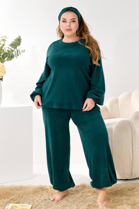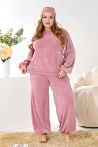 М’який та теплий домашній костюм, зшитий з комфортної трикотажної тканини. Матеріал дуже приємний до тіла та ідеально підходить для затишного домашнього відпочинку. Виріб складається з кофти, штанів та аксесуара. Кофта класичного, вільного крою з округлим вирізом горловини. Довгі рукави-ліхтарики зібрані на м'яку резинку, що надає силуету жіночності.