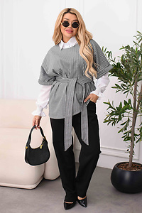 Комплект складається з легкої сорочки, текстурованого жилета та класичних штанів, що забезпечує жіночну та динамічну посадку. Подовжений жилет у дрібну клітинку доповнений довгим поясом, який акцентує увагу на талії та формує елегантний силует.