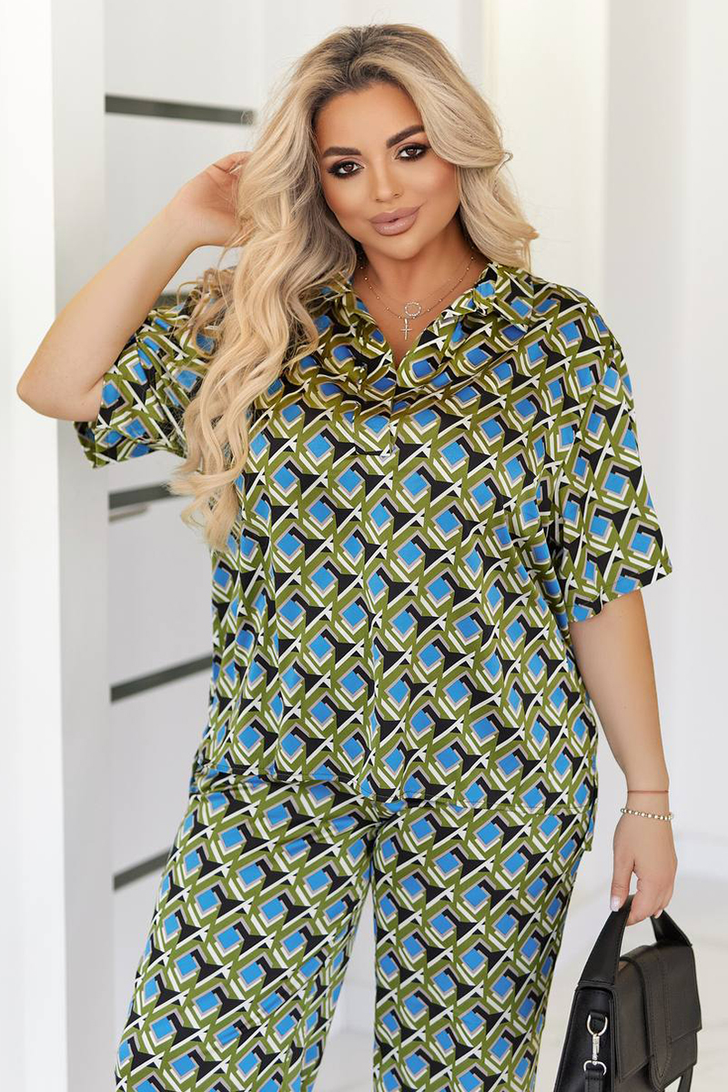 Верх ансамблю представлений вільною сорочкою з короткими рукавами. Модель оформлена класичним відкладним коміром та акуратним розрізом на грудях без застібок, що додає образу легкості. Для додаткової свободи рухів з боків сорочки передбачені лаконічні розрізи.