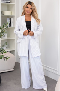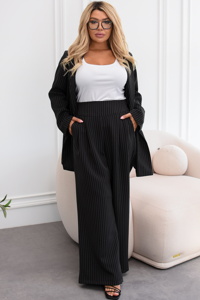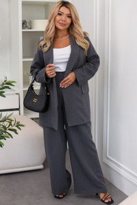 Він складається з подовженого піджака прямого крою без застібки та широких брюк із високою талією. Піджак має накладні кишені з клапанами та злегка вільний фасон, що забезпечує комфорт у носінні. Брюки широкі, вільні, створюють витончений та стильний образ.