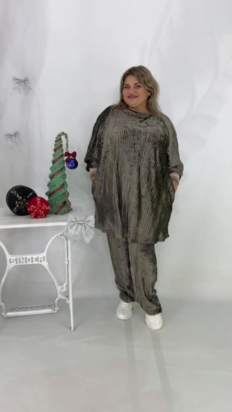 Красивий елегантний костюм-двійка, зшитий із м'якого велюру «гофре». Тканина має виразну вертикальну фактуру, приємна до тіла, дуже тепла та створює стильний, дорогий вигляд. Модель має вільний, розслаблений крій, що забезпечує комфортну посадку та м'яко приховує недоліки фігури.