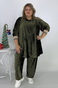 Красивий елегантний костюм-двійка, зшитий із м'якого велюру «гофре». Тканина має виразну вертикальну фактуру, приємна до тіла, дуже тепла та створює стильний, дорогий вигляд. Модель має вільний, розслаблений крій, що забезпечує комфортну посадку та м'яко приховує недоліки фігури.