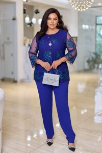 Стильний костюм вільного силуету – прекрасний варіант для створення святкових образів. Блуза з рукавами ¾, декорована вишивкою на сітці з візерунками спереду та на рукавах.