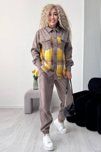 Стильний комфортний костюм, зшитий з поєднання м'якого вельвету та фланелі. Сорочка вільного, трохи подовженого крою. Комір класичний відкладний. Рукавм з манжетами. На грудях розташовані накладні кишені, оздоблені вставками з клітчастої фланелі, що додає виробу акценту. Застібається модель на ґудзики.