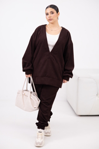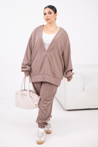 Дуже вільна кофта з глибоким V-подібним вирізом, довгий рукав на манжеті. Штани джогери, пояс та низ виробу на резинці, по боках кишені. Майка базова в рубчик.