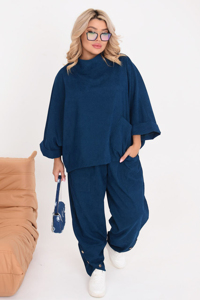Кофта вільного крою з рукавами довжини ¾ та коміром-стійкою. Спереду розмістилася накладна кишеня. Просторі штани внизу декоровані рядом ґудзиків. Також виробу є дві накладні кишені. Найкраще доповнити костюм взуттям на низькому ходу – лоферами, кедами чи ботильйонами.