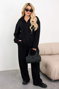 Затишний елегантний костюм-двійка, зшитий з м'якої фактурної в'язки з вертикальним візерунком. Тканина дуже приємна до тіла та чудово підходить для прохолодної пори року. Виріб складається з кофти на блискавці та широких штанів. Кофта вільного, об'ємного крою (оверсайз) з високим коміром-стійкою. Модель застібається на центральну блискавку. Лінія плеча спущена, а низ кофти зібраний на манжет.