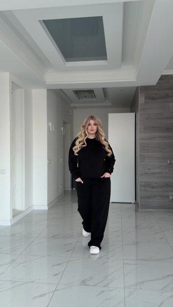 Світшот вільного крою, низ виробу не оброблений. Брюки - труби на високій посадці, в поясі гумка і шнурок, накладні кишені. Нижній манжет не оброблений, тому довжину можна коригувати самостійно.