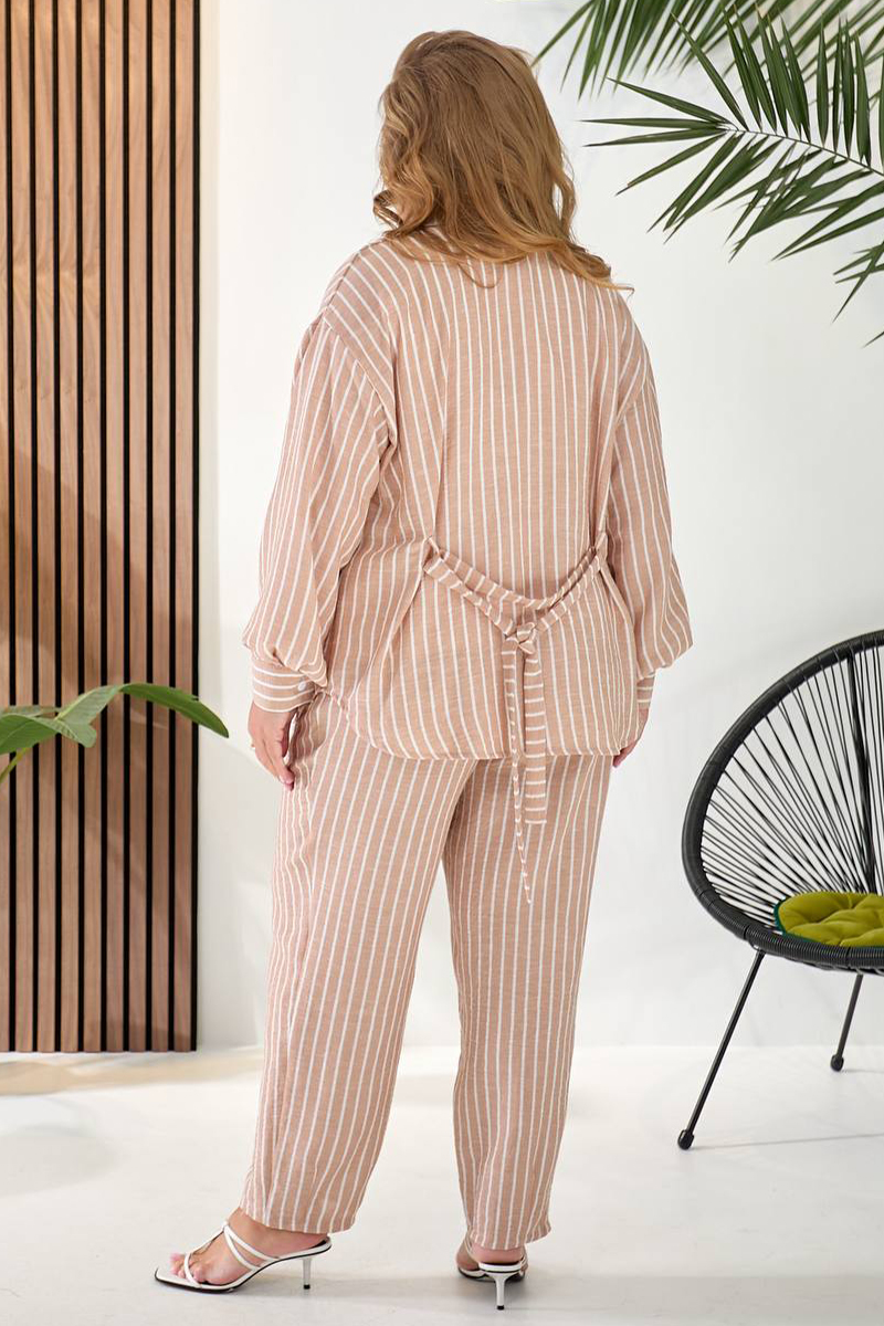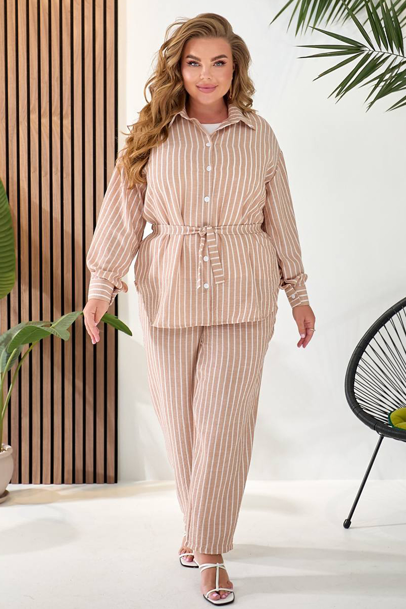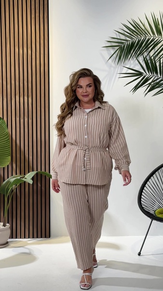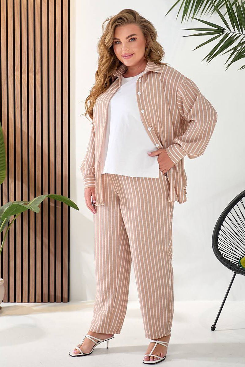 Ансамбль складається з трьох продуманих речей. Базою слугує лаконічна біла майка без рукавів, виготовлена з м'якого турецького куліру. Вона ніжно прилягає до тіла та має акуратні розрізи з боків. Поверх неї одягається простора лляна сорочка вільного крою з довгими рукавами, що зручно застібається на ґудзики. У комплекті йде пояс, який дозволяє вигідно акцентувати талію. Завдяки такому крою сорочка чудово працює і як легкий верхній шар, і як самостійний елемент образу.