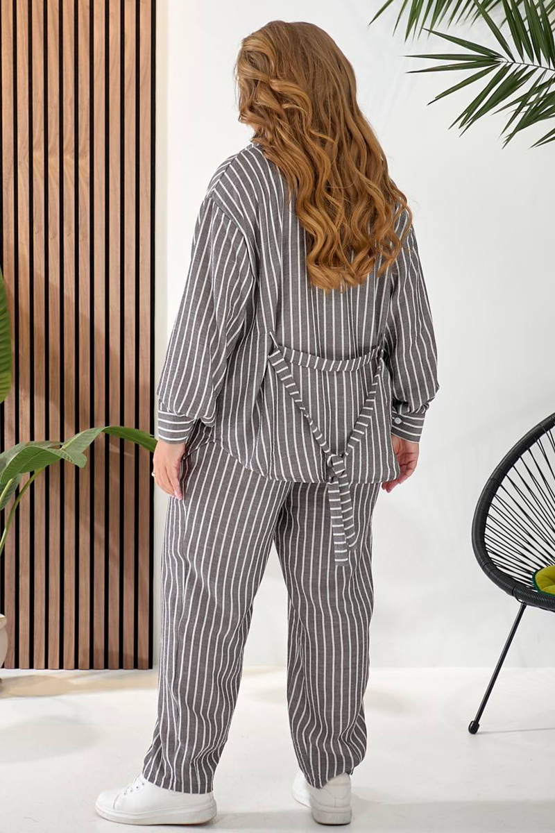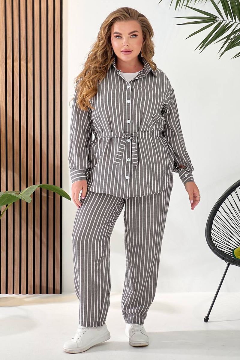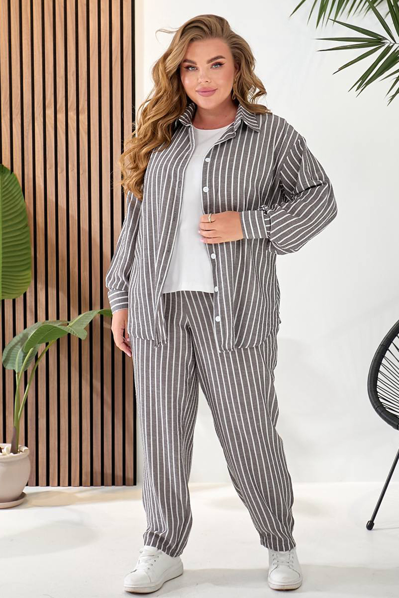 Ансамбль складається з трьох продуманих речей. Базою слугує лаконічна біла майка без рукавів, виготовлена з м'якого турецького куліру. Вона ніжно прилягає до тіла та має акуратні розрізи з боків. Поверх неї одягається простора лляна сорочка вільного крою з довгими рукавами, що зручно застібається на ґудзики. У комплекті йде пояс, який дозволяє вигідно акцентувати талію. Завдяки такому крою сорочка чудово працює і як легкий верхній шар, і як самостійний елемент образу.