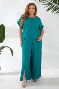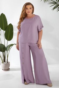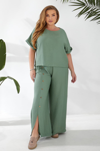 Стильний костюм на кожен день. Виготовлений з якісного приємного матеріалу – льону жатки. Блуза вільного крою і штани-палаццо з "родзинкою" в крої створить вам неповторний образ.