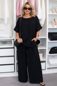 Стильний зручний костюм-двійка – чудова база для повсякденних образів. Виріб виготовлений з натурального, приємного до тіла льону жатки. Футболка вільного крою з короткими широкими рукавами. Виріз горловини округлий.