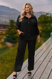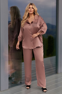 Елегантний костюм, що складається з сорочки вільного крою та штанів-палаццо.