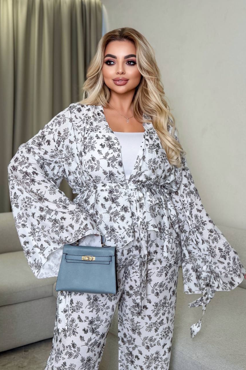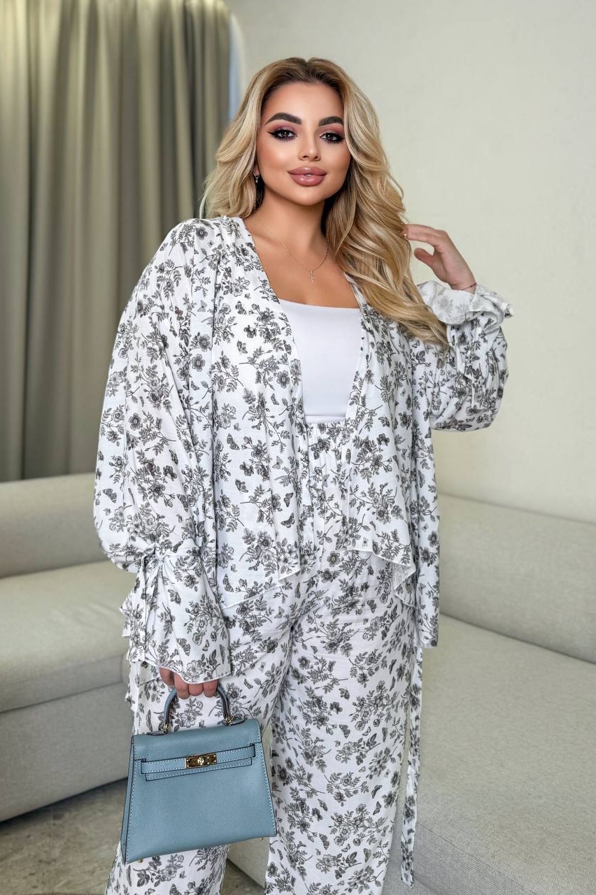 Кардиган на запах із поясом - підкреслює талію. Рукави-трансформери змінюй стиль під настрій, вони внизу широкі, є знімні завʼязки, якими можна зробити іншу форму рукава завʼязавши їх. Вільні брюки з високою посадкою та м’якою резинкою - ідеально сідають по фігурі.