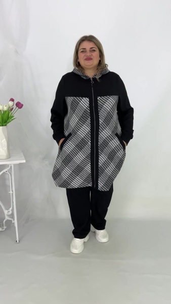 Кофта на змійці, подовжена, з капюшоном та боковими кишенями. Штани класика, пояс на резинці, посадка висока.