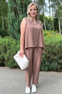 Блуза вільного фасону, без рукавів, мініатюрний виріз, перед коротший, спинка довша. Брюки по типу чіноси, пояс на резинці, по боказж кишені, внизу підвороти.